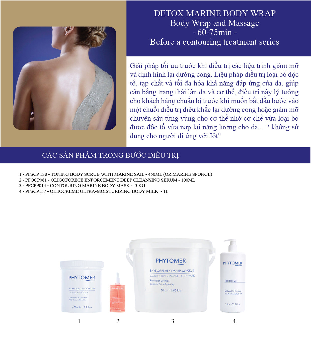 Giải pháp tối ưu trước khi điều trị các liệu trình giảm mỡ và định hình lại đường cong. Liệu pháp điều trị loại bỏ độc tố, tạp chất và tối đa hóa khả năng đáp ứng của da, giúp cân bằng trạng thái làn da và cơ thể, điều trị này lý tưởng cho khách hàng chuẩn bị trước khi muốn bắt đầu bước vào một chuỗi điều trị điêu khắc lại đường cong hoặc giảm mỡ chuyên sâu từng vùng cho cơ thể nhờ cơ chế vừa loại bỏ được độc tố vừa nạp lại năng lượng cho da . " không sử dụng cho người dị ứng với Iốt"